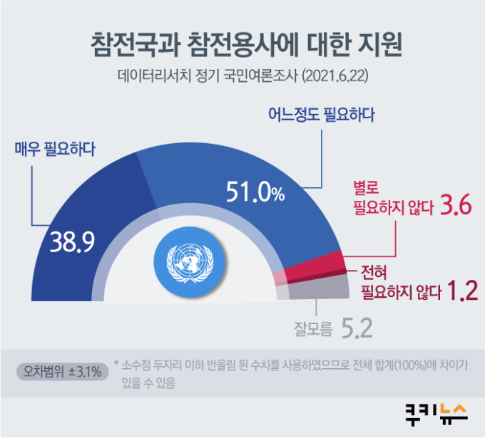 아울러 응답자 중 대다수가 6‧25 참전국과 참전용사에 대한 지원이 필요하다고 답변했다. 같은 응답자를 대상으로 진행한 설문 조사 결과 6‧25 전쟁에 참여한 이들을 지원해야 한다는 답변은 90.0%였다. 필요하지 않다는 응답은 4.8%에 그쳤다. 잘 모르겠다는 5.2%였다.