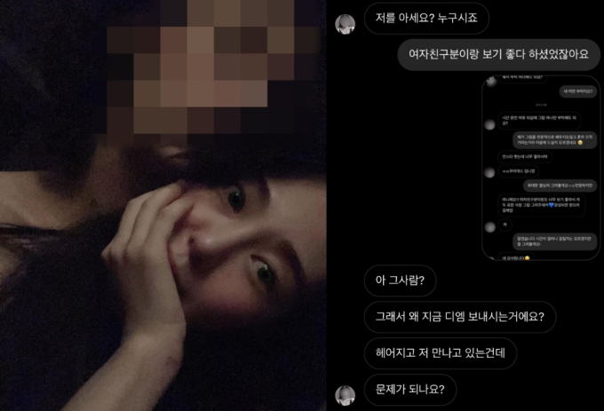 누구인지 묻는 권민아에게 B씨가 "여자친구분이랑 보기 좋아라고 하셨잖나"라고 보내자 권민아는 "아 그사람? 그래서 왜 지금 DM 보내나. 헤어지고 저 만나고 있는건데 문제가 되나"라고 답했다.