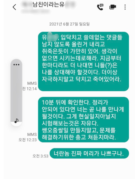 이어 "게시글 삭제 후 제 앞에 나타나지 말고 더 이상 SNS에 이와 관련된 글을 올리지 말라는 내용이었다"며 "'닥치고 죽어있어라'는 말은 죽은 듯이 조용히 있으라는 뜻이었지만 표현이 격했던 것은 인정하고 사과드린다"고 했다.