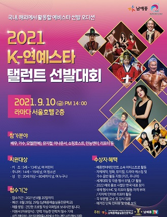 다양한 분야의 연예인을 배출하고 있는 남예종예술실용전문학교는 밀레니엄영화제작소와 공동으로 새로운 이미지의 스타를 찾는 ‘K-연예스타 탤런트 선발대회’를 오는 9월 10일 라마다 서울호텔에서 개최한다고 1일 밝혔다.