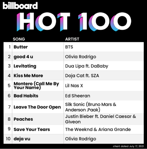 지난 5월 21일 발매된 버터는 첫 주부터 핫 100에 1위로 데뷔해 정상을 지키고 있다. 이로써 통산 3주간 1위를 지켰던 첫 영어곡 '다이너마이트'를 넘어 BTS 역대 발매곡 중 최장기간 1위에 등극했다.