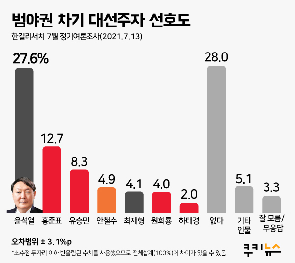 쿠키뉴스 의뢰로 여론조사기관 한길리서치가 지난 10~12일 전국 만 18세 이상 남‧여 1001명을 대상으로 ‘범야권 차기대선후보 선호도’를 조사한 결과 윤석열 전 검찰총장이 27.6%를 기록했다. 홍준표 국민의힘 의원은 12.7%로 2위를 나타냈고 유승민 전 의원은 8.3%로 3위를 차지했다.