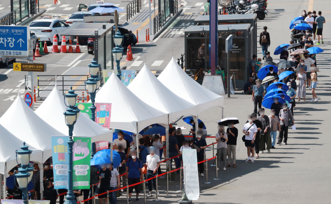 [쿠키뉴스] 박효상 기자 = 18일 서울 중구 서울역 광장 코로나19 임시 선별검사소에서 시민들이 검사소에서 대여한 우산을 쓴 채 검사를 위해 차례를 기다리고 있다.