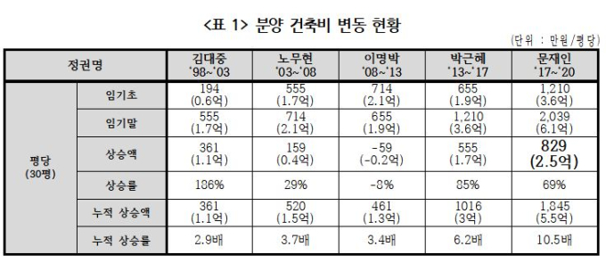 경실련에 따르면 노무현 정부 임기초 30평 건축비는 1억7000만원에서 임기말 2억1000만원으로 4000만원 상승했다. 이명박 정부 동안 분양가상한제가 시행되자 건축비는 2억1000만원에서 1억9000만원으로 2000만원 하락했다. 박근혜 정부 임기 동안 건축비는 총 1억7000만원 상승했고, 문재인 정부들어서는 2억5000만원 뛰었다.