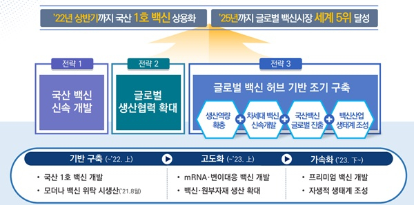 또 정부는 반복되는 감염병 팬데믹(세계적 유행) 상황에서 향후 백신 개발 주도권을 확보하고, 국민에게 국산 백신을 접종할 수 있도록 다양한 전략 백신에 대한 지원을 강화한다는 방침이다.
