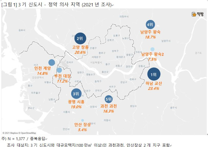 9일 직방이 어플리케이션 이용자를 대상으로 전체 응답자 1486명 중 아파트 청약 계획이 있다고 답한 총 1377명에게 수도권 3기 신도시와 올해 진행 예정인 사전청약지의 청약 의사 선호 지역에 대한 설문 응답 결과로 분석을 진행했다.