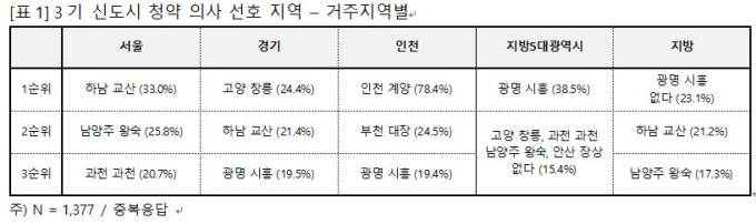 인천 거주자는 ‘인천 계양’이 80% 가까이 압도적으로 높게 나타났고 그 다음으로는 인천과 인접한 서부권의 ▲부천 대장 ▲광명 시흥 순이었다. 지방5대광역시 거주자는 ‘광명 시흥’을 가장 많이 선택했고 나머지 지역은 큰 차이를 보이지 않았다.