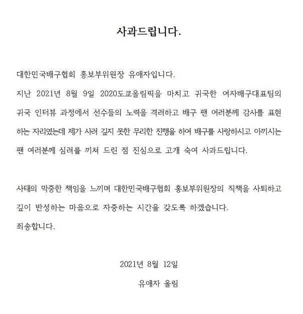 이어 “사태의 막중함을 느끼며 대한민국배구협회 홍보부위원장의 직책을 사퇴하고 깊이 반성하는 마음으로 자중하는 시간을 갖도록 하겠다”고 덧붙였다.