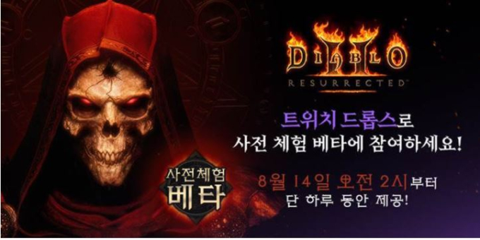 트위치 드롭스는 디아블로2: 레저렉션 오픈 베타 사전 체험과 함께 시작된다. 이 시간부터 다음 날인 15일 오전 4시 사이에 트위치의 디아블로 II: 레저렉션 카테고리 안의 레저렉션 관련 게임 방송을 150분 이상 시청하면 오픈 베타 사전 체험을 PC 플랫폼에서 참여할 수 있는 드롭스 보상을 받을 수 있다.