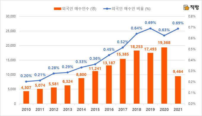 17일 직방이 등기정보광장에서 발표하는 ‘매매에 의한 소유권이전등기’ 통계를 분석한 결과, 외국인의 부동산 매매 건수는 전체 매수인 대비 1% 미만이지만 꾸준한 증가세를 보이고 있다. 2010년 이후부터 계속 증가하다가 2020년 다소 주춤하면서 올해 다시 증가했다.
