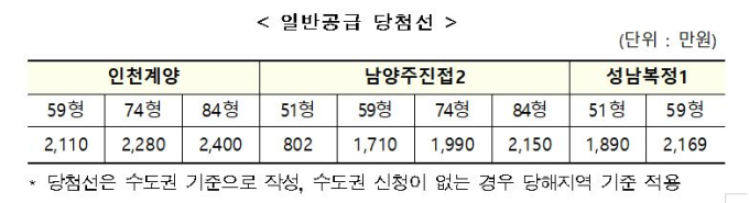 ‘일반공급’ 당첨선은 평균 1945만원 수준이며, 청약저축 최고 불입액은 인천계양 3800만원, 남양주진접2 2820만원, 성남복정1 3790만원을 기록했다.