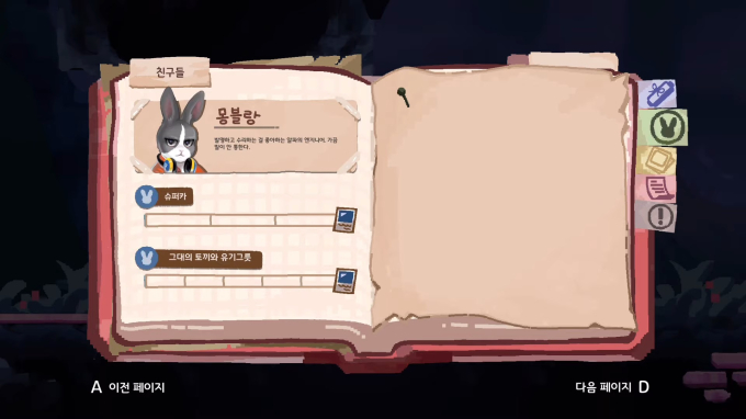 김 : 맞아요. 기본적으로 토끼들이 탐험을 하는 내용이에요. 토끼들이 동경하던 토끼 탐험가가 있었다던가, 토끼들이 옛날에 살았던 굴에 대한 설정이라던가, 토끼들의 과거 사연이라던가, 이런 부분들을 세부적으로 깊게 설정을 했어요. 메인 스토리만 놓고 보면 보이는 부분이 적겠지만 플레이어가 원한다면 수집 요소들을 통해서 소소한 과거 이야기들을 접할 수 있도록 만들었어요.