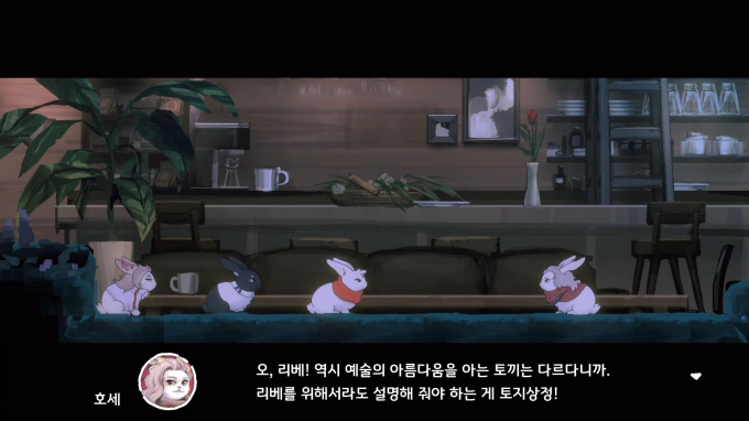 김 : 데모 버전에선 공개가 안 됐지만 나머지 토끼들은 메인 스토리나 플래포밍 상에서 리베를 도와주거나, 혹은 리베가 다른 토끼들을 도와줘야 되는 등 서로 영향을 미치도록 설계 중이에요. 또 플래포밍을 하던 와중에 리베가 다른 토끼들과 잡담을 하거나 선물을 줄 수 있는데요, 이에 따라 스토리에 작은 변화가 생길 수 있어요. 조작할 수 있는 캐릭터는 리베 뿐이지만, 친구 토끼들이 있기 때문에 홀로 플레이하고 있다는 느낌이 들지 않으실 거예요.