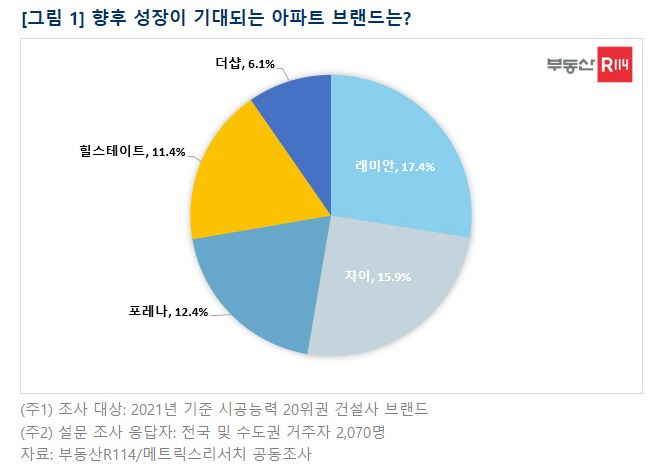 부동산R114와 메트릭스리서치가 2021년 9월 15일부터 29일까지 전국에 거주하는 2070명의 소비자를 대상으로 ‘아파트 브랜드 이미지 설문 조사’를 공동 진행한 결과, 향후 성장이 기대되는 아파트 브랜드에 ‘삼성물산 래미안’이 1위로 꼽혔다.