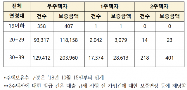 20대 이하로 좁히면 무주택자 비중은 더 늘었다. 20대 이하가 전세안심대출을 받은 경우는 9만 5732건이었는데 이 중 9만 3675건(97.9%)이 무주택자였다. 금액기준으로는 20대 이하 무주택자의 대출금액은 11조 8565억원으로 전체 12조 1668억원의 97.4%였다.