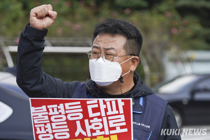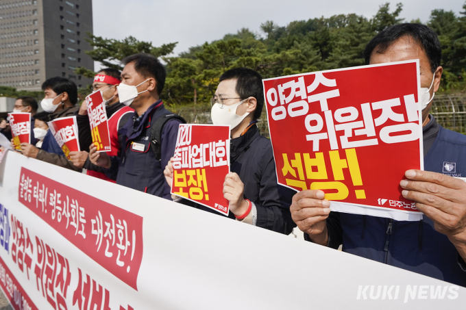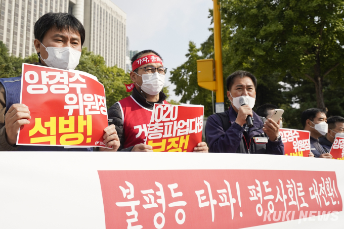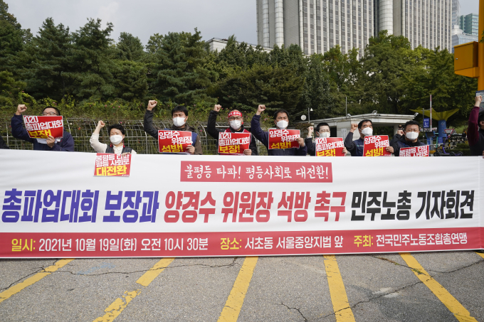 [쿠키뉴스] 임형택 기자 = 19일 오전 서울 서초구 법원삼거리 앞에서 열린 총파업대회 보장과 양경수 위원장 석방 촉구 민주노총 기자회견에서 참가자들이 구호를 외치고 있다.