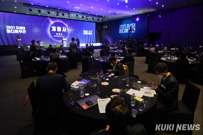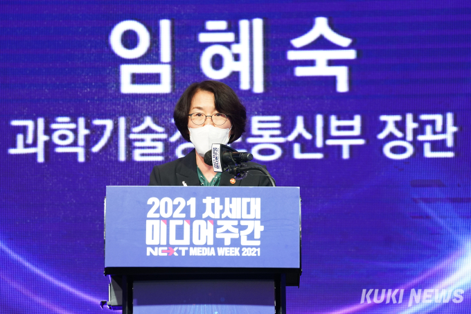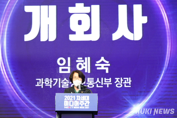 [쿠키뉴스] 임형택 기자 =1일 서울 여의도 글래드여의도 블룸홀에서 열린 '2021 차세대미디어주간'에서 임혜숙 과학기술정보통신부 장관이 개회사를 하고 있다.
