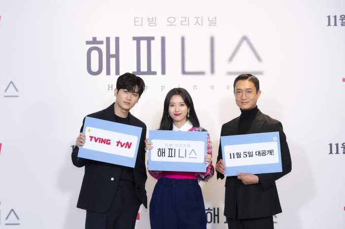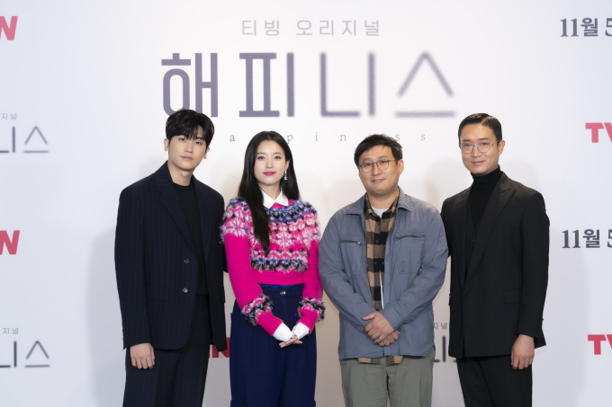 배우들 역시 눈길을 끈다. 윤새봄 역을 맡은 한효주는 총격전과 액션 등을 선보이는 경찰특공대와, 자연스럽게 일상을 사는 아파트 주민을 동시에 연기할 예정이다. 그는 “윤새봄은 내게 선물처럼 주어진 캐릭터”라면서 “비슷한 나이에 실제 내 모습과 비슷한 캐릭터를 만난 건 운명이다”고 말했다. 군 전역 후 복귀작으로 ‘해피니스’를 택한 박형식은 “오랜만에 촬영을 하니 카메라가 어색하기도 했지만 금방 적응해서 잘 촬영했다”면서 “그동안 보여드리지 못한 모습을 확인할 수 있을 것”이라고 자신감을 드러냈다. 조우진은 공익과 사익 사이에서 고뇌하는 한태석을 연기한다. 그는 “도전의식이 컸던 캐릭터와 작품”이라면서 “입체적인 역할인 만큼 감독님과 자주 상의하며 좋은 결과물을 내려했다”고 힘주어 말했다. 안 감독은 “배우들이 모두 준비를 잘해온 데다 캐릭터와 싱크로율도 좋았다”며 “디렉팅을 고민할 필요가 없었다”며 기대감을 키웠다. 오는 5일 오후 10시40분 티빙, tvN 동시 첫 공개. 12부작 편성. 주 2회 방영.