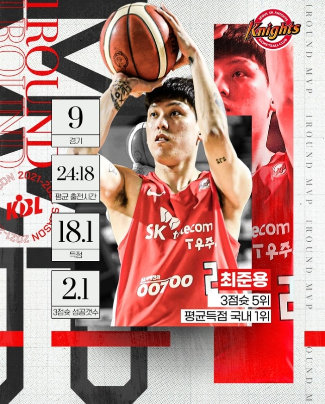한국프로농구연맹(KBL)은 4일 “‘2021~2022 정관장 프로농구’ 1라운드 MVP 투표에서 총 유효 투표수 48표 중 36표를 획득한 SK 최준용이 1라운드 MVP에 선정됐다”고 밝혔다.