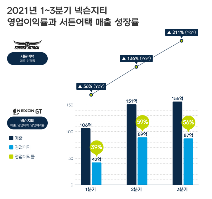 넥슨지티가 서든어택 흥행에 힘입어 실적 호조세를 이어갔다. 넥슨지티는 2021년 3분기 매출 156억원, 영업이익 87억원, 순이익 85억원을 기록, 매출은 지난해 대비 179% 증가, 영업이익과 순이익은 모두 흑자전환 했다. 영업이익률은 56%에 달했다.