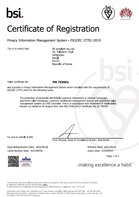SK에코플랜트, 개인정보보호 인증 취득