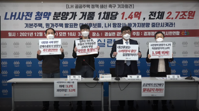경실련 부동산건설개혁본부 김성달 국장은 “대선 후보들은 원가주택과 기본주택을 (공약으로) 이야기 한다. 모두 거품 없는 공공주택을 대규모로 공급하겠다는 것”이지만 “정작 관련 부처에서는 대규모 물량을 땅도 보상이 안 된 상태에서 비싸게 소비자에게 공급하고 있다. 이는 집값 상승 불안감을 이용해 소비자에게 거품투성인 주택을 떠넘기는 것 아닌가 우려 된다”고 말했다.