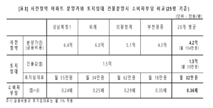 경실련은 이를 20개 지구 사전청약 분양가 25평 기준 4억2000만원과 비교하면 소비자부담이 3분의 1로 줄어드는 것으로 추산했다. 또한 토지임대료 월 32만원 역시 사전청약 분양가(4억2000만원)를 마련하기 위한 대출이자 등 금융비용 보다는 더 낮은 것으로 주장했다.