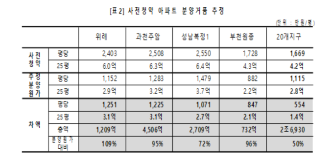 비교 결과 사전청약 분양가는 경실련 분양가와 1채당 1억4000만원(평당 554만원), 1만8602세대 전체로는 2조 6930억원의 차이를 보였다. 경실련 분양가는 평균 평당 1115만원, 25평 기준 2억8000만원이다.