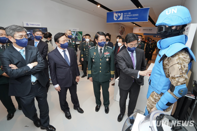 함상욱 외교부 다자외교조정관(왼쪽부터)과 김만기 국방부 정책실장, 황대일 육군참모차장, 최종문 외교부 제2차관이 3일 서울 중구 동대문디자인플라자(DDP)에서 열린 '2021 서울 유엔 평화유지 장관회의 계기 특별 전시회' PKO 장비전시관을 살펴보고 있다.