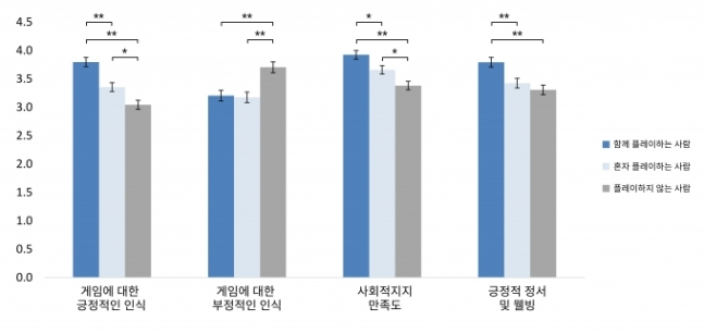 연구에 따르면 중장년층에서 게임을 누군가와 함께 플레이하는 사람이 게임을 혼자 플레이하는 사람, 그리고 게임을 하지 않는 사람보다 웰빙 지수와 사회적 지지 만족도가 높았다. 또 게임을 혼자 플레이하더라도 게임을 전혀 하지 않는 사람보다 사회적 지지 만족도가 높다는 결과가 나왔다.