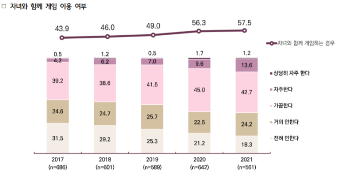 콘진원 조사에 따르면 자녀와 게임을 즐긴다고 답한 학부모는 57.5%로 2017년(43.9%)부터 5년간 꾸준히 상승 중이다. 학부모 C(40‧여‧양천구)씨와 D씨(37‧여‧양천구)역시 초등학생 자녀들 때문에 게임을 시작했다.