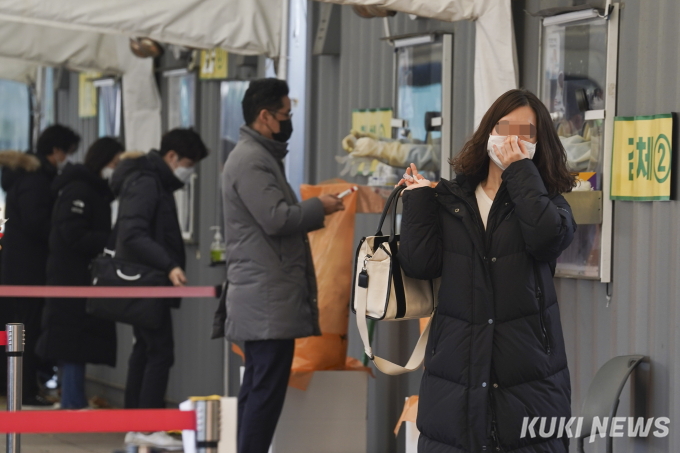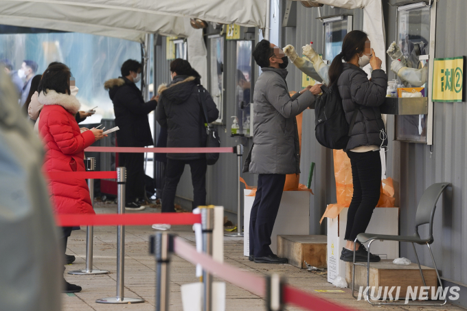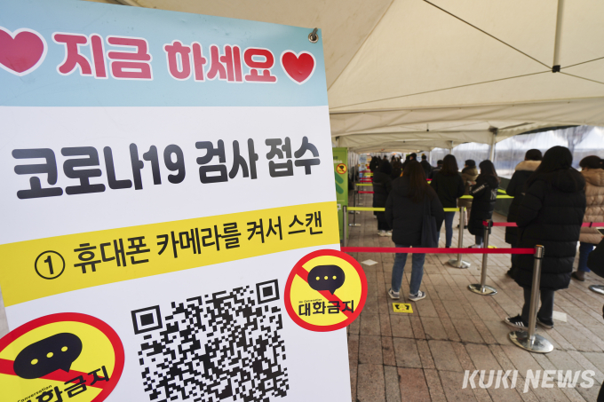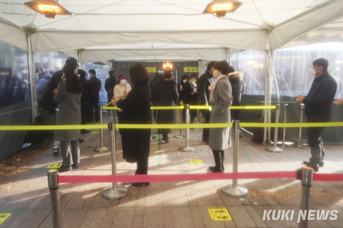 코로나19 신규 확진자가 6919명으로 집계된 23일 오전 서울 중구 서울시청 앞 코로나19 임시선별진료소에서 시민들이 검사를 받기 위해 줄 서 있다.
