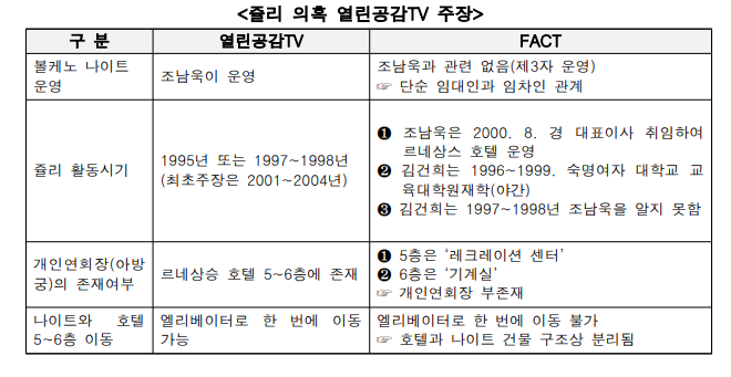 김씨가 과거 유흥업소에서 접대부로 일했다는 소위 ‘쥴리 의혹’을 제기한 여권 성향 유튜브 ‘열린공감TV’를 향해서 “객관적 사실과 완전히 배치되는 터무니없는 허위 선동으로 법적 처벌을 피하기 어려울 것”이라고 지적했다. 열린공감TV는 앞서 제보자 안모씨를 내세워 “1997년 5월 ‘쥴리’라는 예명을 쓰던 김씨로부터 접대를 받았다”는 증언을 보도한 바 있다.