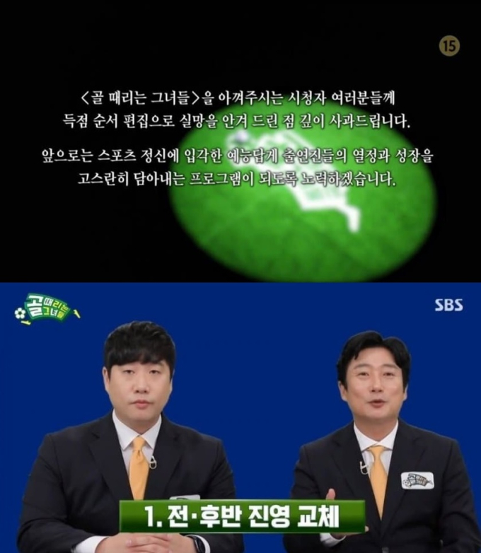 새로 정비한 ‘골때녀’는 방송에 앞서 논란에 사과하는 자막 방송을 내보냈다. 제작진은 “득점 순서 편집으로 실망을 안겨 깊이 사과드린다”면서 “앞으로는 스포츠 정신에 입각해 예능답게 출연진의 열정과 성장을 고스란히 담아내는 프로그램이 되도록 노력하겠다”고 다짐했다. 중계를 맡은 배성재와 이수근 역시 쇄신안을 공개하며 △ 촬영분 전후반 진영 교체 △ 중앙 점수판 설치 △ 축구 경기 전문가인 경기 감독관 입회 하에 경기를 진행 △ 경기 내용과 주요 기록 홈페이지 공개 등을 약속했다.