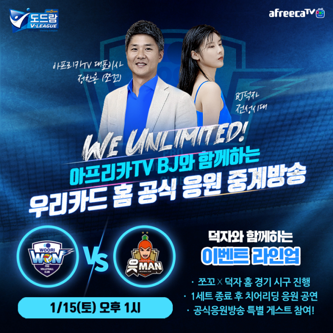 아프리카TV 정찬용 대표이사와 BJ 덕자전성시대가 남자 배구 우리카드와 OK금융그룹의 맞대결이 치러지는 15일, 특별 게스트로 참가한다.