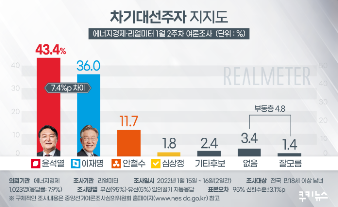 여론조사기관 리얼미터가 에너지경제의 의뢰로 지난 15~16일 전국 유권자 1023명을 대상으로 실시한 ‘차기 대선 후보 지지도’에서 윤 후보는 43.4%를 기록했다. 이 후보는 36.0%였다.