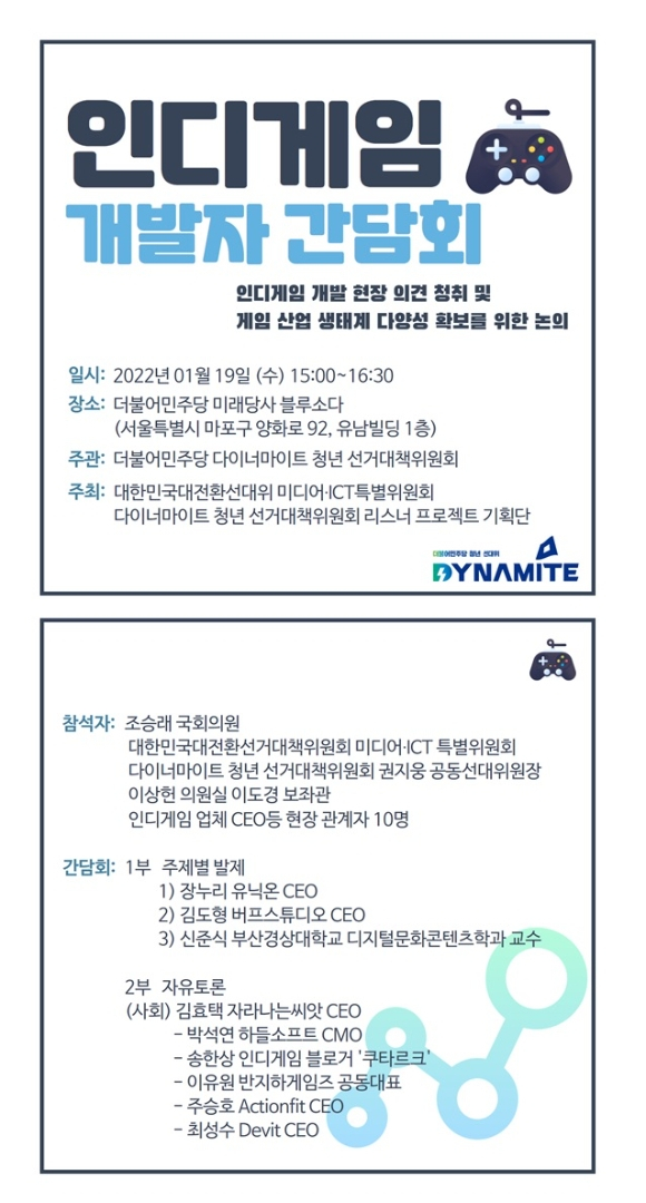 이번 간담회는 민주당 선대위 미디어·ICT 특별위원회와 청년선대위 리스너 프로젝트 기획단이 공동으로 주최하며 주제별 발제와 자유토론으로 구성된다. 현장에는 조승래 의원(화상 참석), 권지웅 청년선대위 공동선대위원장, 미디어·ICT 특위 디지털콘텐츠단 김정태 단장, 이상헌 의원실 이도경 보좌관, 소규모 게임 개발업체 CEO 등 인디게임 현장 관계자 10명이 참석할 예정이다.