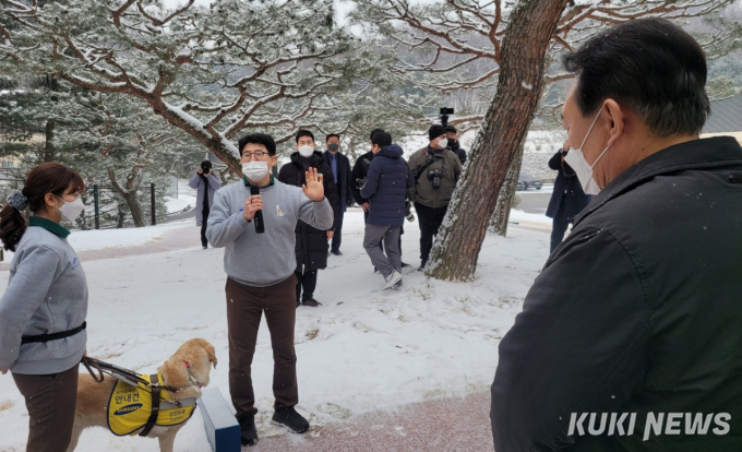 윤 후보는 안내견학교 구석구석을 살피며 안내견의 역사, 일생 등에 대한 관계자의 설명을 들었다. 은퇴한 안내견 등이 쉬고 있는 공간에선 직접 공간 안으로 들어가 안내견을 쓰다듬는 등 교감을 나눴다. 안내견과 소통하는 내내 윤 후보의 얼굴에선 미소가 떠나질 않았다.
