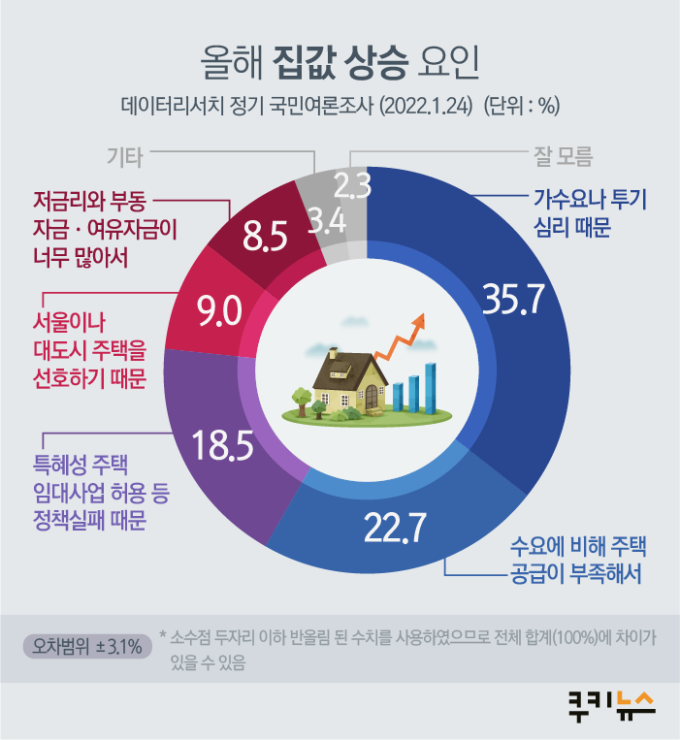 반대로 올해 집값 상승 요인으로는 ‘가수요나 투기심리’가 가장 많은 지목을 받았다. 같은 대상에게 ‘올해 집값이 오른다면 가장 큰 이유는 무엇인가’를 묻고 △저금리와 부동자금·여유자금이 많아서 △수요에 비해 주택 공급이 부족해서 △가수요나 투기심리 때문 △특혜성 주택임대사업 허용 등 정책실패 때문 △서울이나 대도시 주택을 선택하기 때문 △기타 △잘 모르겠다 중 선택하도록 했다.
