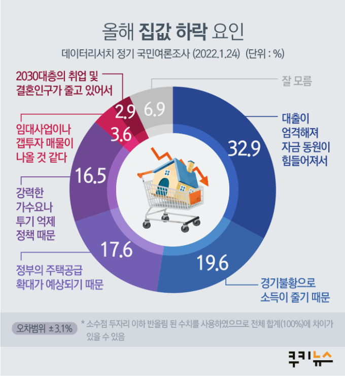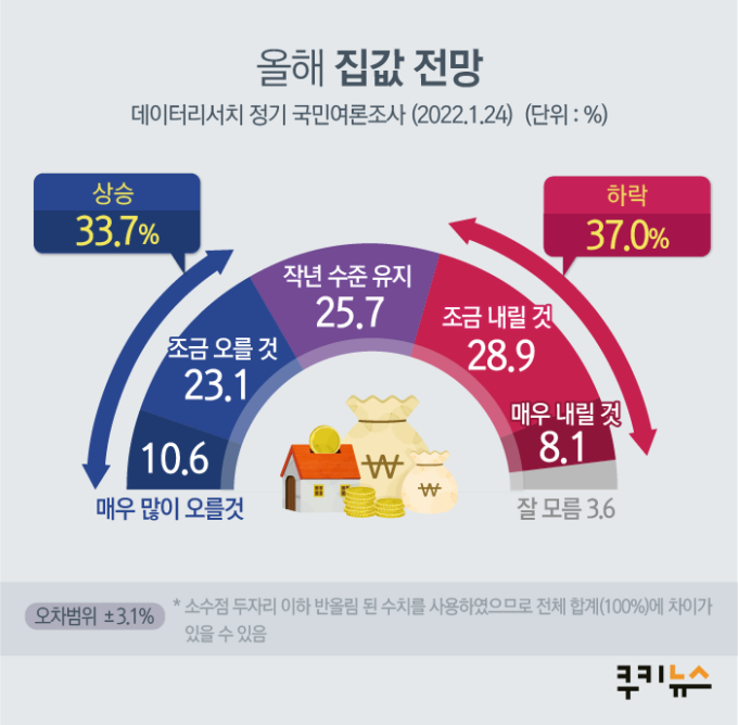 쿠키뉴스 의뢰로 여론조사 전문기관 데이터리서치가 지난 24일 전국 18세 이상 성인 1000명에게 ‘올해 집값에 대해 어떻게 예상하는가’를 물은 결과, 응답자 37.0%가 ‘내릴 것(매우 많이 내릴 것 8.1%, 조금 내릴 것 28.9%)’이라고 답했다.