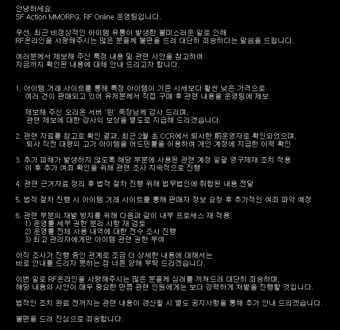 CCR은 지난 11일 RF온라인 홈페이지 공지사항을 통해 “최근 비정상적인 아이템 유통이 발생한 불미스러운 일로 인해 RF온라인을 사랑해주시는 많은 분들께 불편을 드려 대단히 죄송하다는 말씀을 드린다”고 밝혔다.