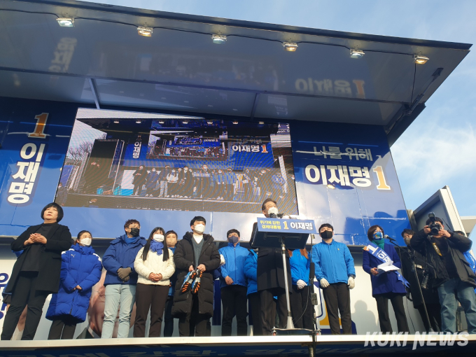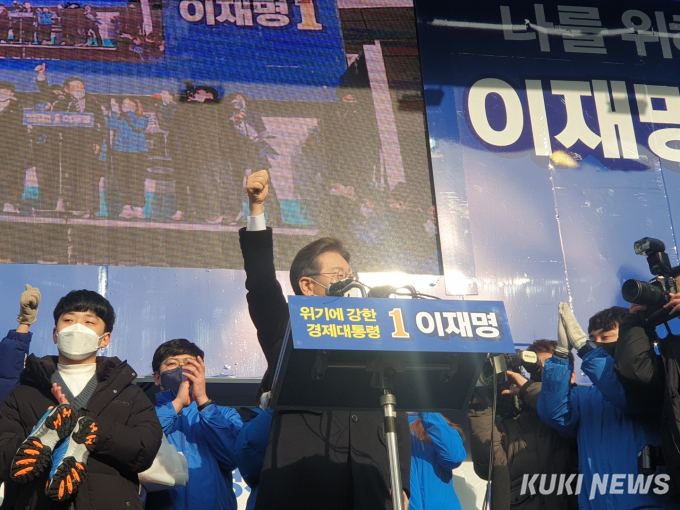 이재명 더불어민주당 후보가 15일 부산 부산진구 부전역 앞에서 공식 선거운동 첫 유세를 펼쳤다. 사진=최기창 기자 이재명 더불어민주당 후보가 15일 부산 부산진구 부전역 앞에서 열린 공식 선거운동 첫 유세에서 손을 들고 있다. 사진=최기창 기자