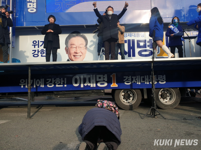 한 지지자가 15일 부산 부전역 앞에서 열린 공식 선거운동 첫 유세에서 이재명 더불어민주당 대선후보에게 큰절을 하고 있다. 사진=최기창 기자 이재명 더불어민주당 대선후보가 15일 부산 부전역 앞에서 열린 공식 선거운동 첫 유세에서 “지도자의 무능과 무지, 무책임은 자랑거리가 아니다. 용서할 수 없는 죄악”이라고 강조했다.