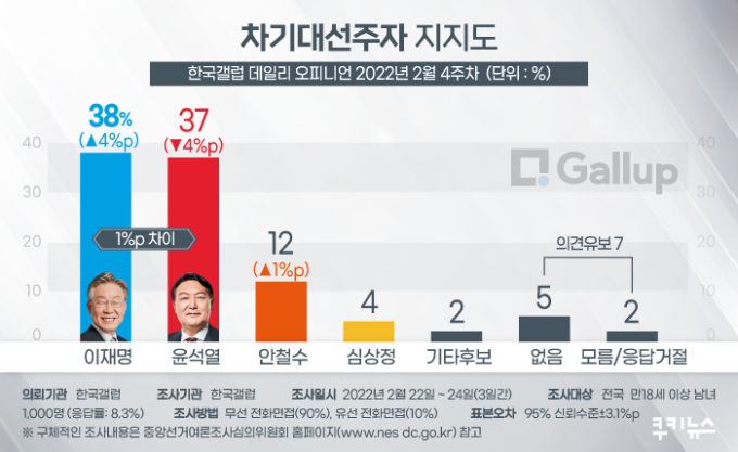 한국갤럽이 2022년 2월 넷째 주(22~24일) 전국 만 18세 이상 1000명을 대상으로 차기 대통령 선호도(다자대결)를 조사한 결과 이 후보는 38%를 기록했다. 윤 후보는 37%를 얻었다. 둘의 차이는 오차범위 안이다.