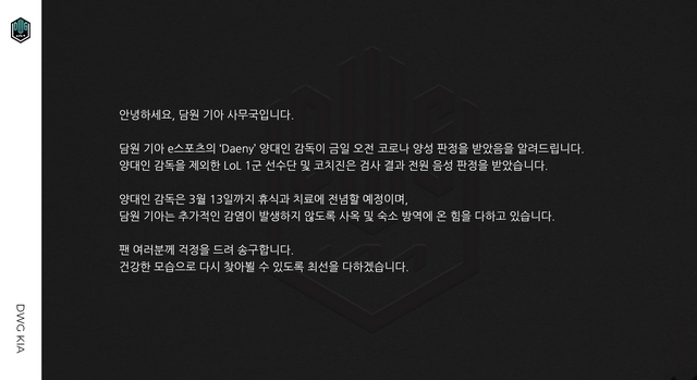 ‘LoL 챔피언스코리아(이하 LCK)’ 소속팀 담원 기아의 양대인 감독이 코로나바이러스 감염증-19(코로나19) 양성 판정을 받았다.