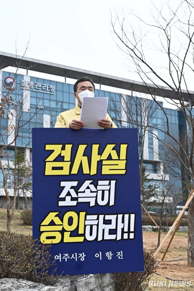 이항진 여주시장은 30일 충북 청주시 질병관리청 청사 앞에서 현장PCR에 대한 방해를 규탄한다며 1인시위를 했다.