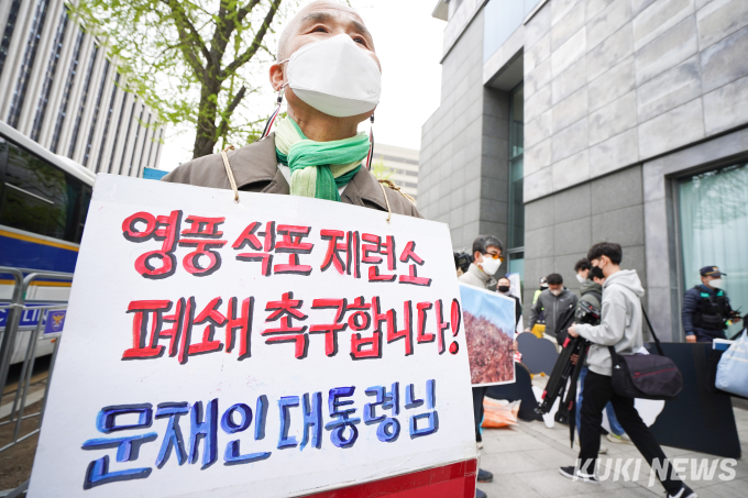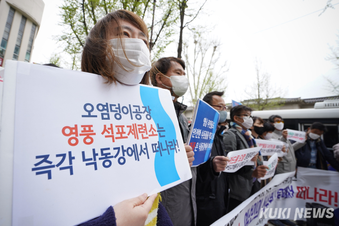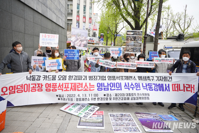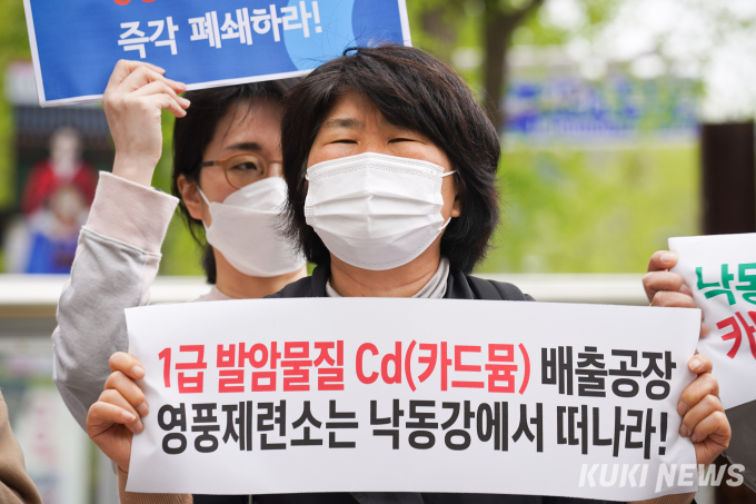 영풍제련소 주변 환경오염 및 주민건강피해공동대책위원회 관계자들이 13일 서울 종로구 통의동 대통령직 인수위원회 인근에서 열린 낙동강 카드뮴 오염 환경파괴 범죄기업 영풍 석포제련소 폐쇄 촉구 기자회견을 하고 있다.