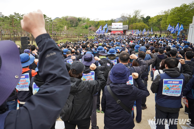 전국금속노동조합원들이 13일 오후 서울 종로구 종묘광장공원에서 열린 '금속노조 2022년 투쟁선포식'에서 노동중심 산업전환, 노정교섭 쟁취를 촉구하며 구호를 외치고 있다.