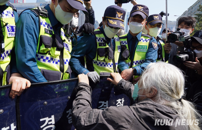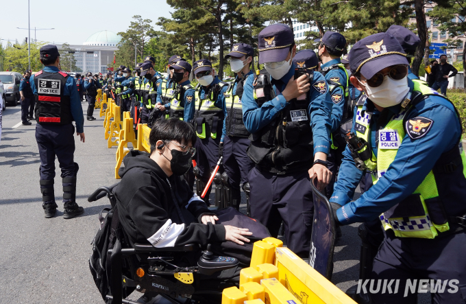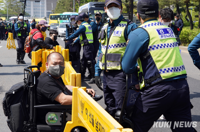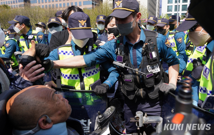 '장애인차별철폐 투쟁대회' 경찰과 대치하는 참가자들 [쿠키포토]