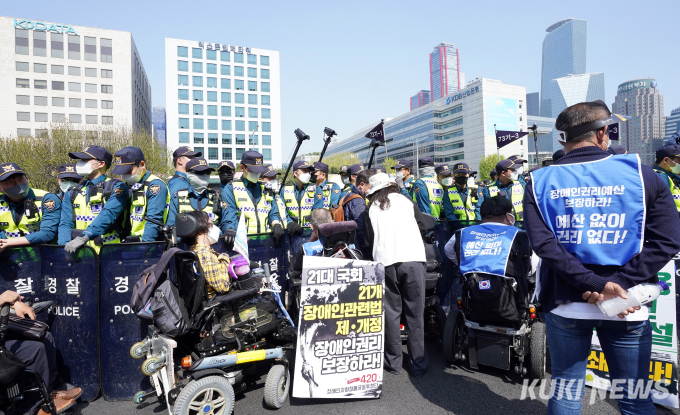 20일 오후 서울 영등포구 이룸센터 앞에서 열린 '420 장애인차별철폐 투쟁결의대회'에서 참가자들이 경찰과 대치하고 있다.